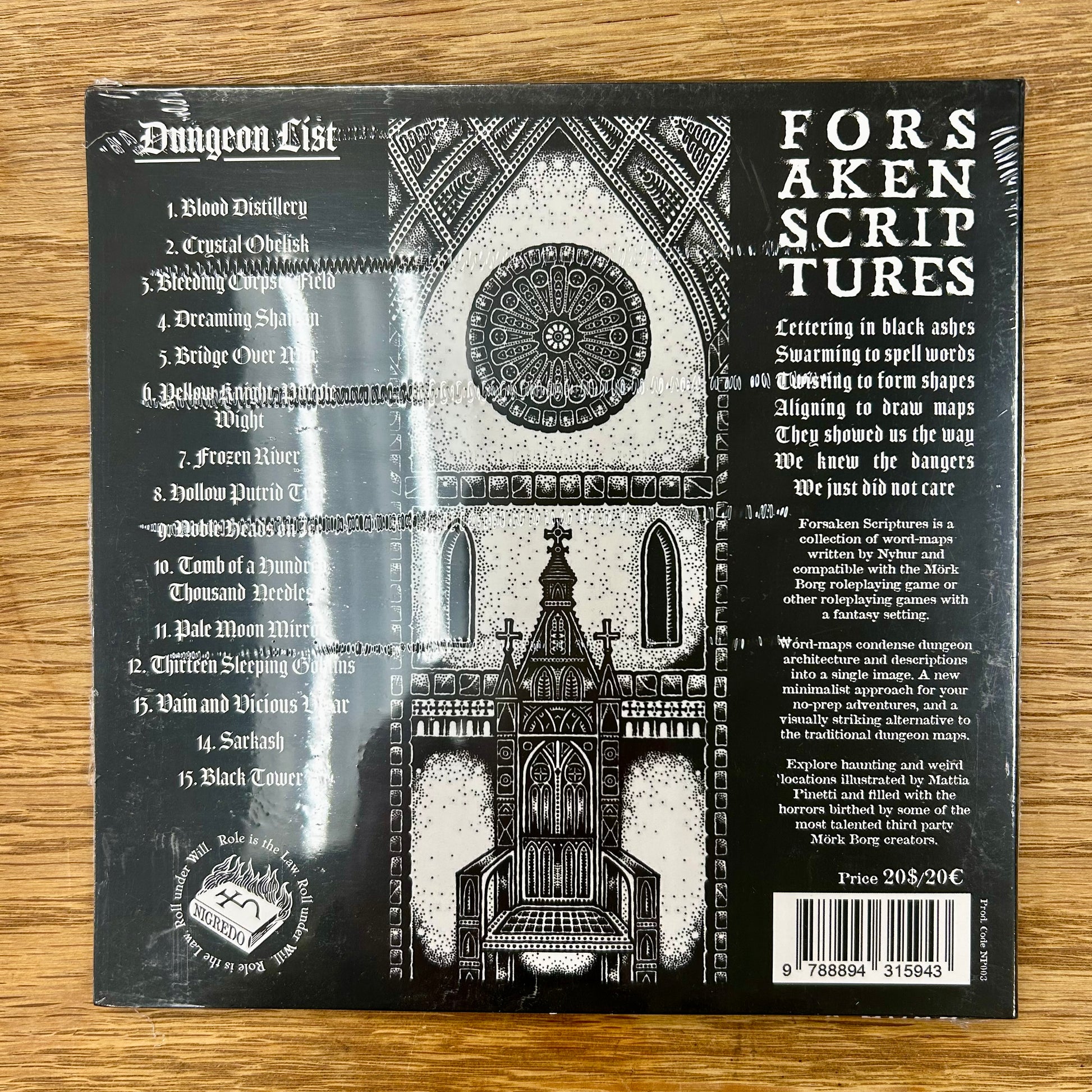 Forsaken Scriptures is a collection of word-maps written by Nyhur and compatible with the Mörk Borg roleplaying game or other roleplaying games with a fantasy setting.
