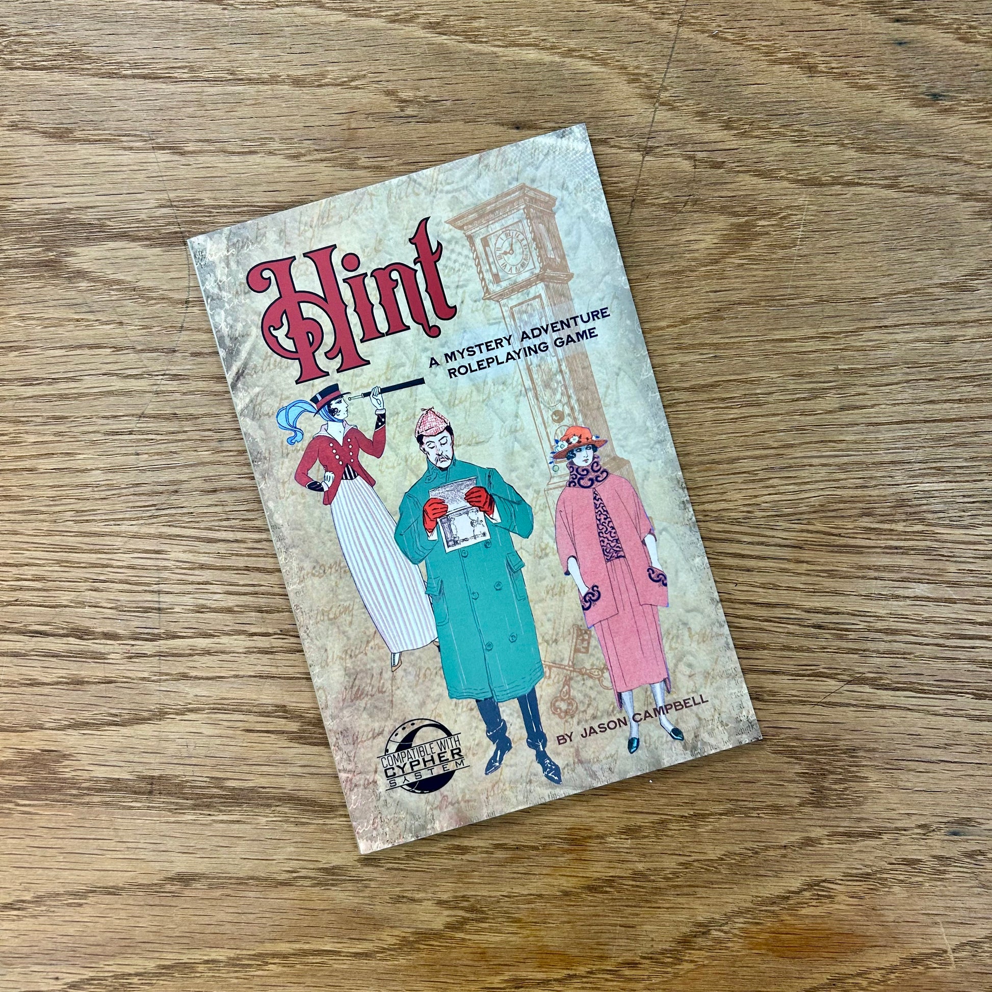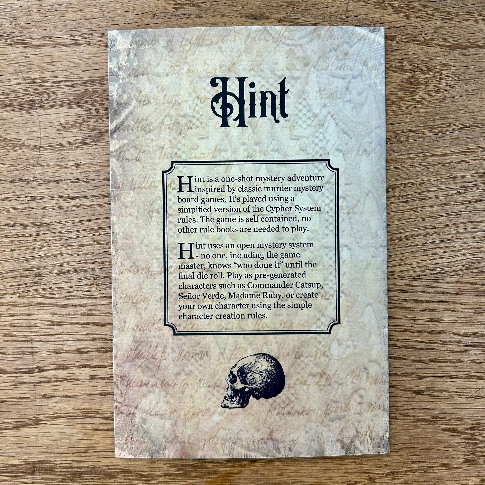Hint is a one-shot mystery adventure inspired by classic murder mystery board games. It’s played using a simplified version of the Cypher System rules. The game is self contained, no other rule books are needed to play.