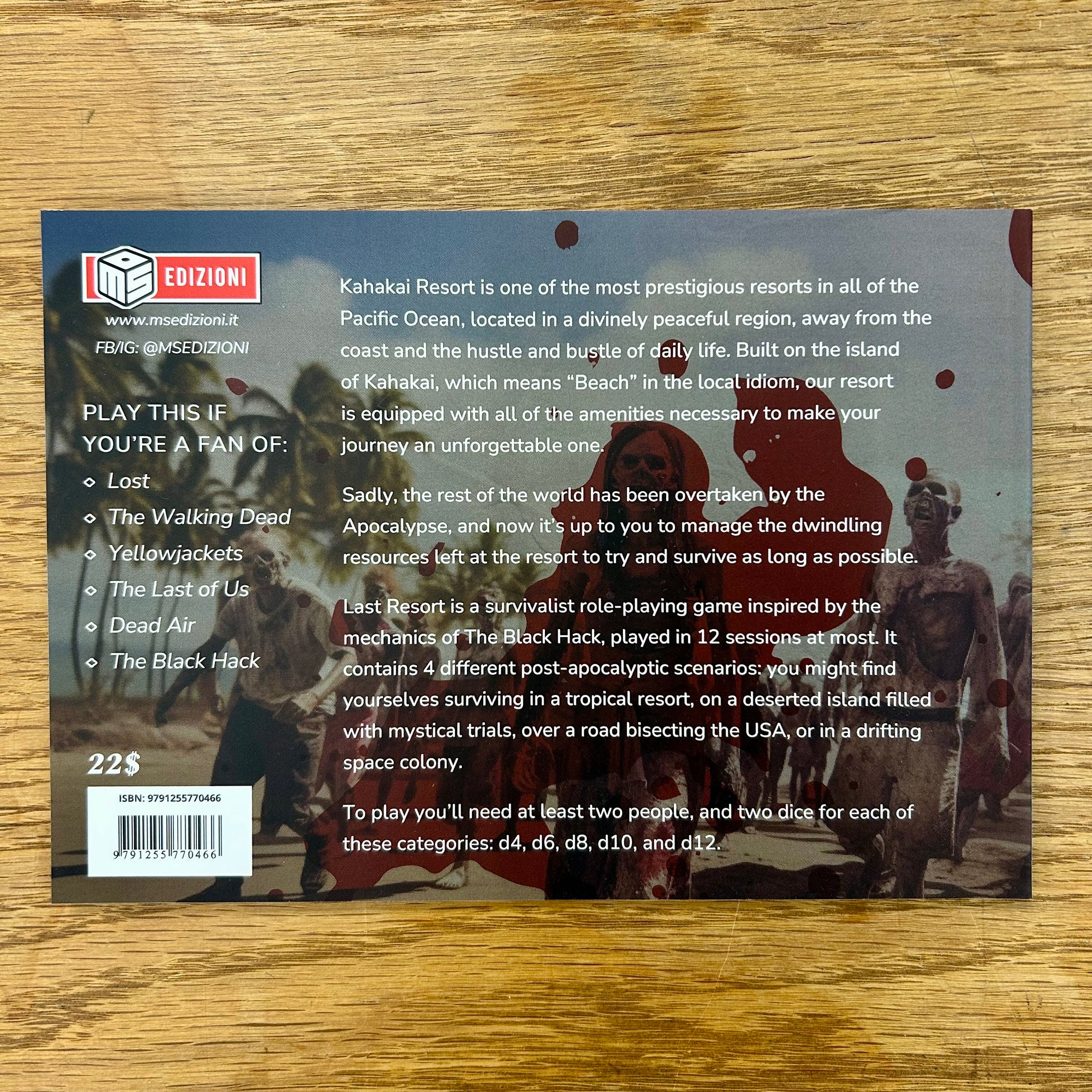 Last Resort is a survivalist role-playing game inspired by the mechanics of The Black Hack, played in 12 sessions at most. It contains 4 different post-apocalyptic scenarios: you might find yourselves surviving in a tropical resort, on a deserted island filled with mystical trials, over a road bisecting the USA, or in a drifting space colony.