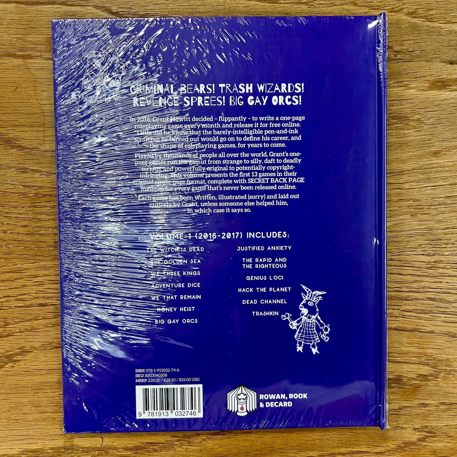 Played by thousands of people all over the world, Grant’s one-page games run the gamut from strange to silly, daft to deadly serious, and powerfully original to potentially copyright-infringing. This volume presents the first 13 games in their original single-page format, complete with SECRET BACK PAGE material for every game that’s never been released online.